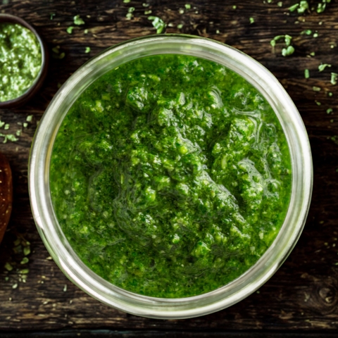 A fresh basil pesto, rich and aromatic, made with fragrant herbs and olive oil.